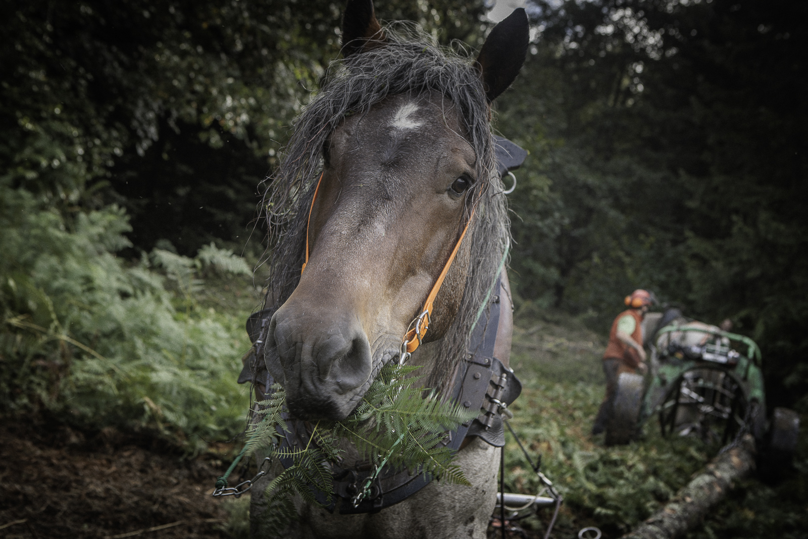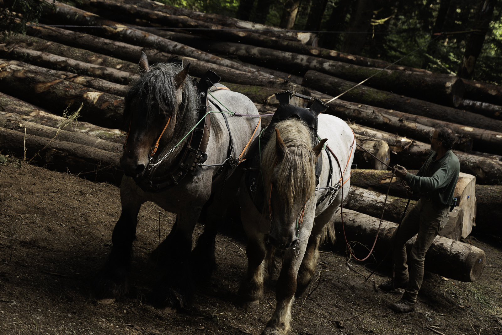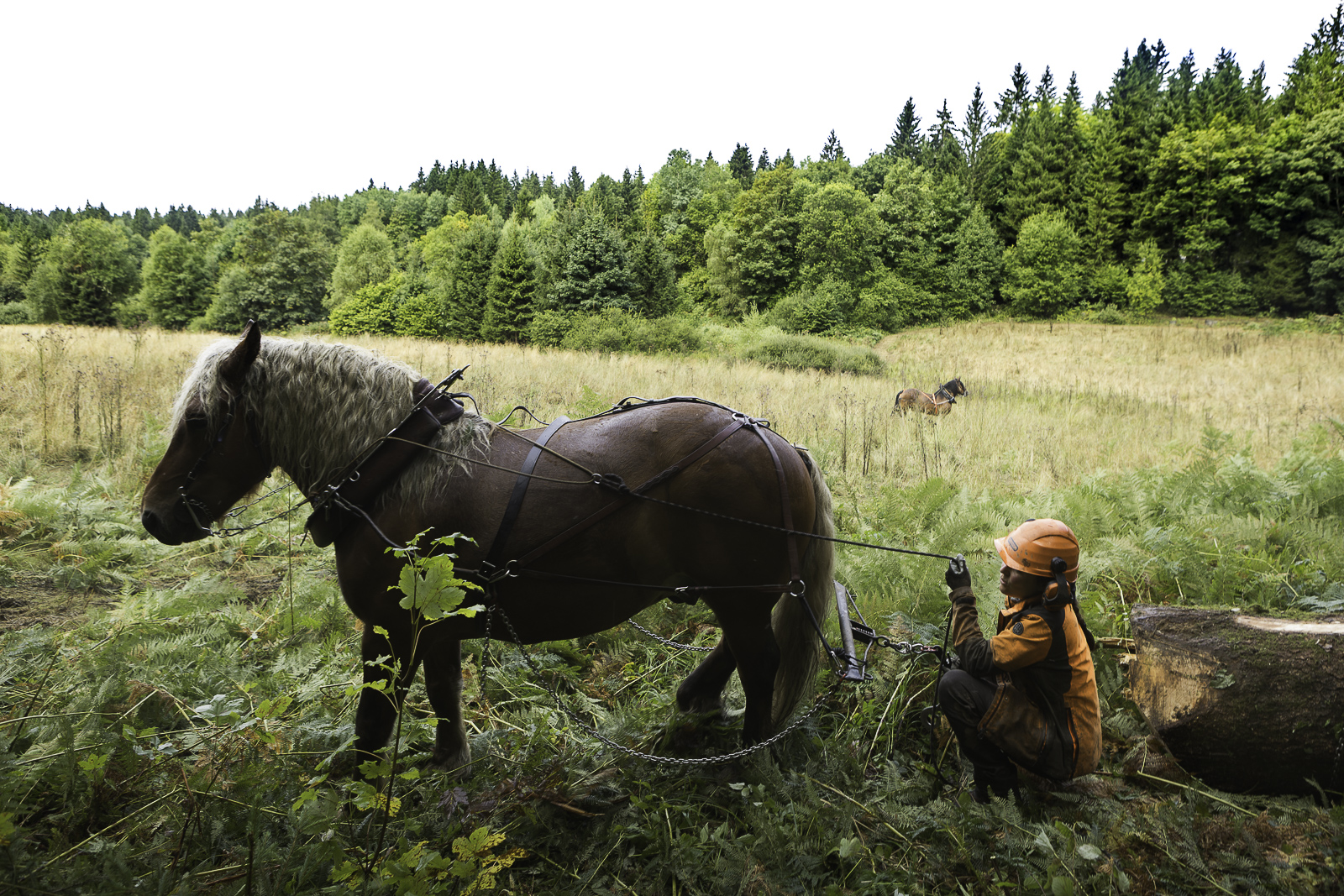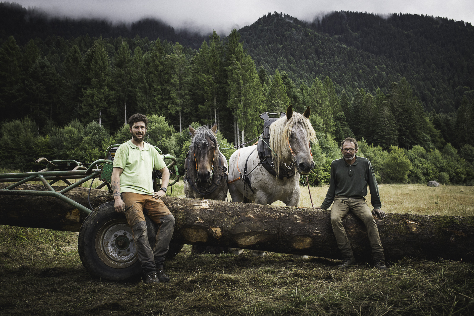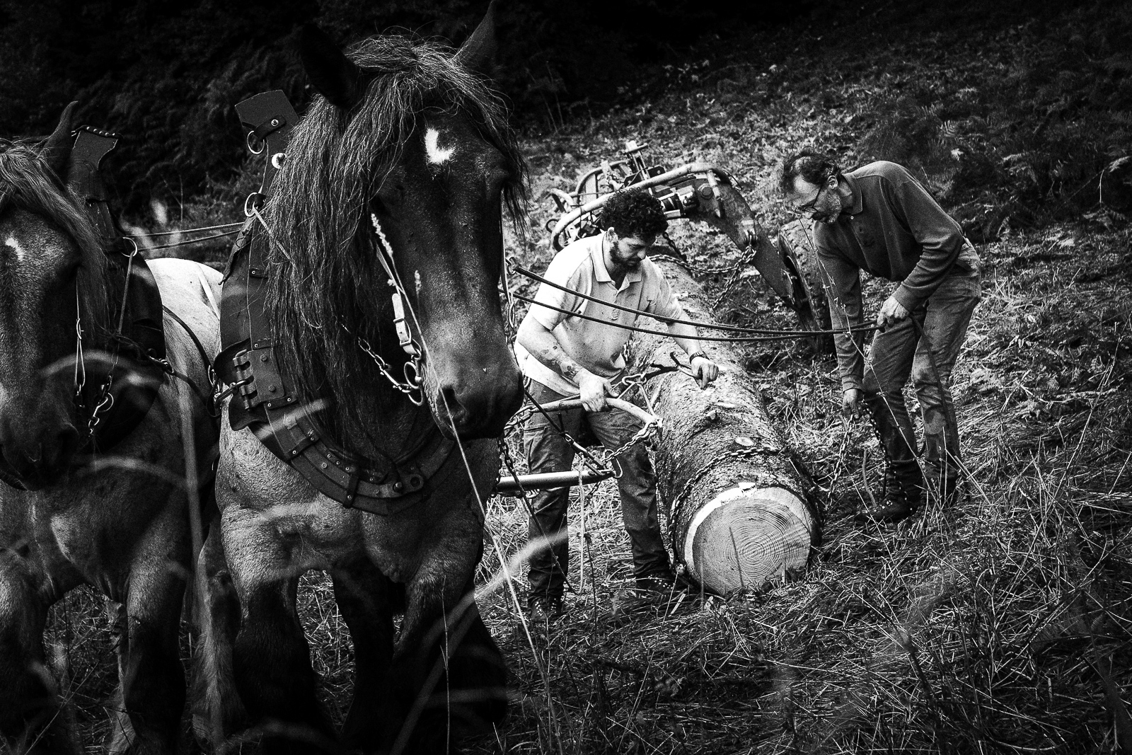 François, Marie Anne et Nadir. Travaux de débardage à cheval – Août 2025 – Marais des Seiglières