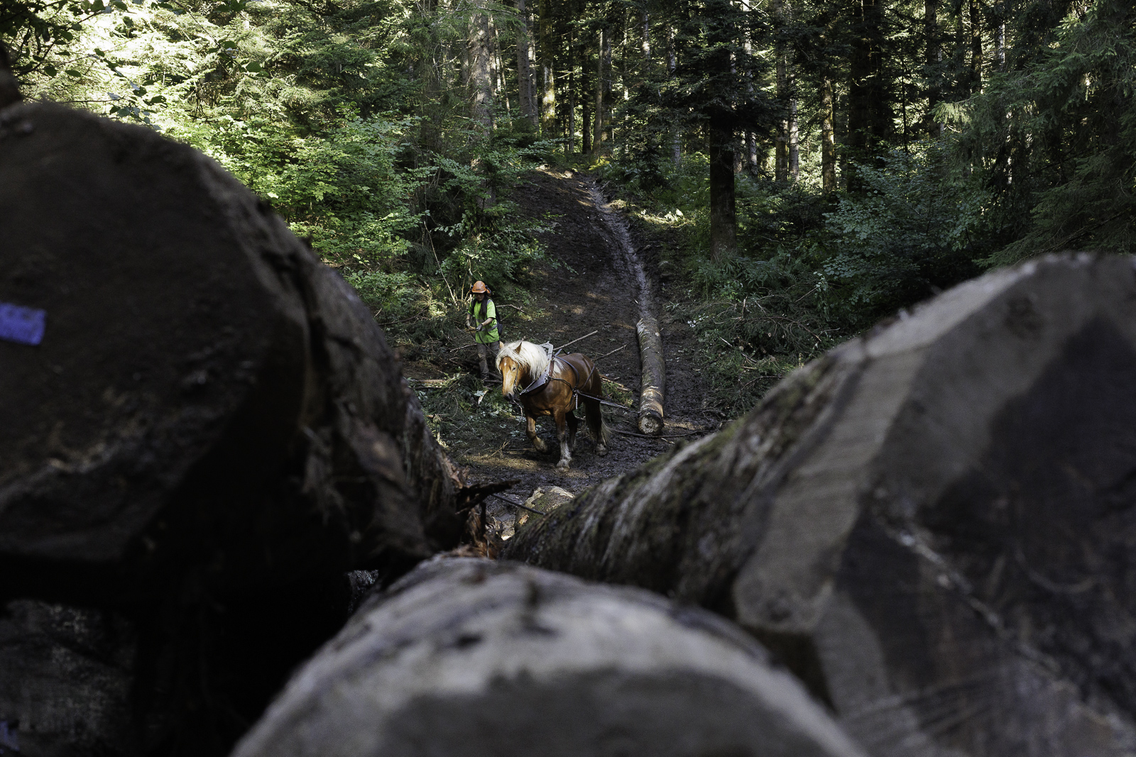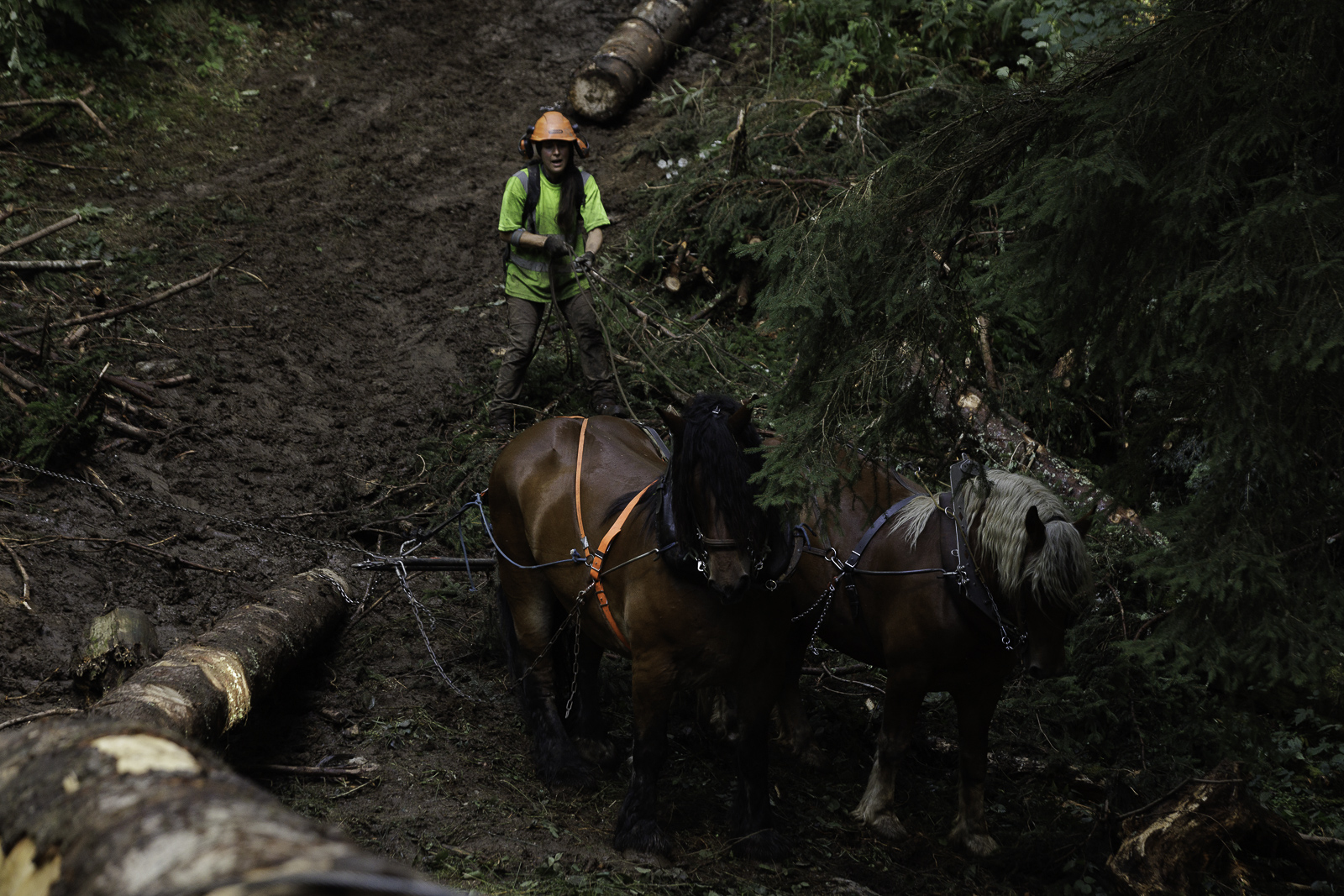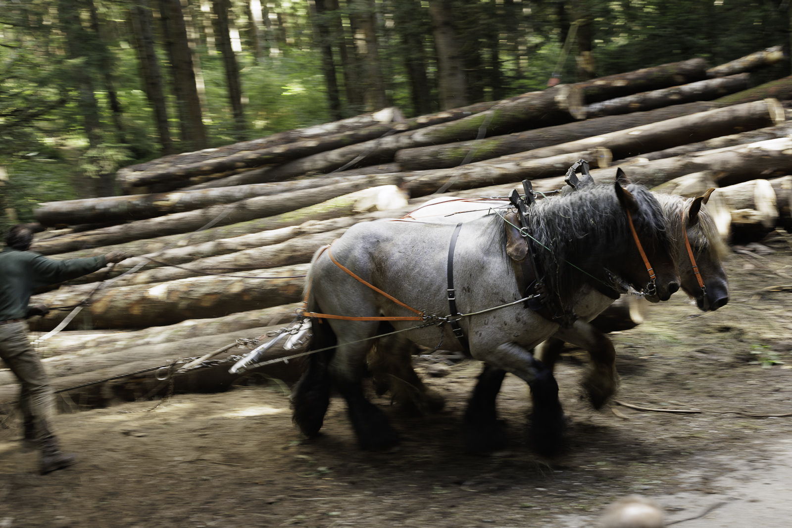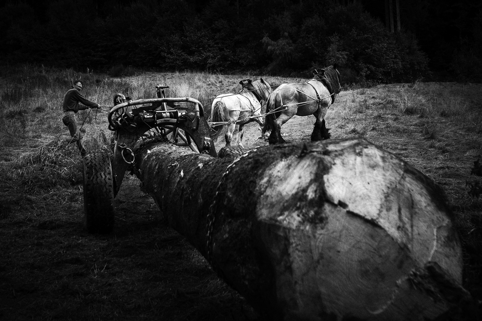 François, Marie Anne et Nadir. Travaux de débardage à cheval – Août 2025 – Marais des Seiglières