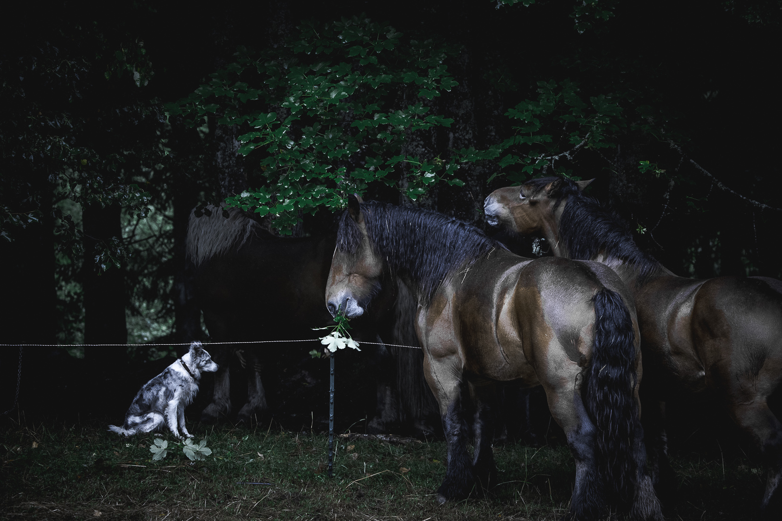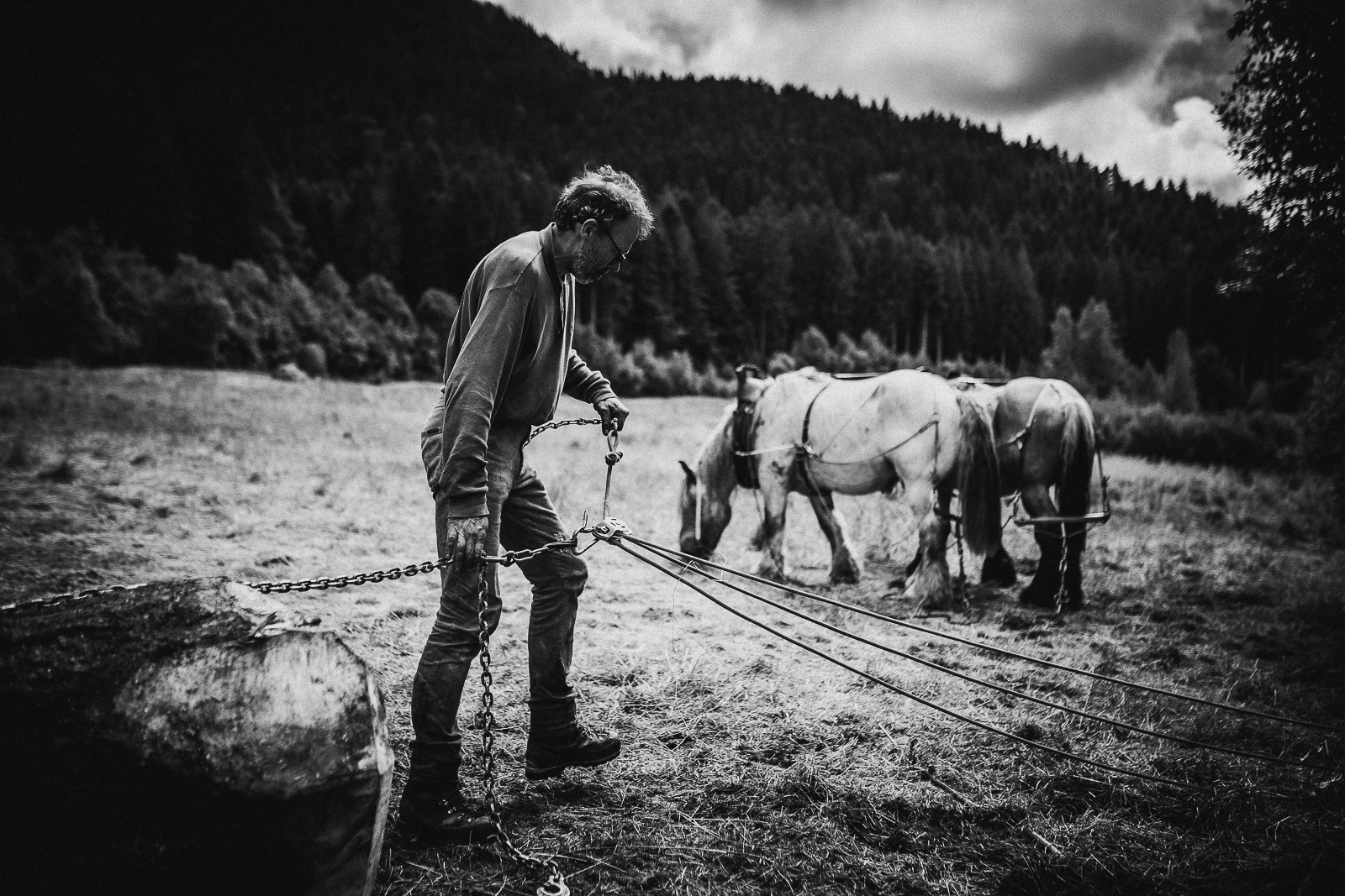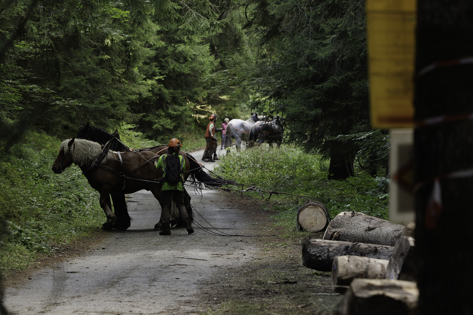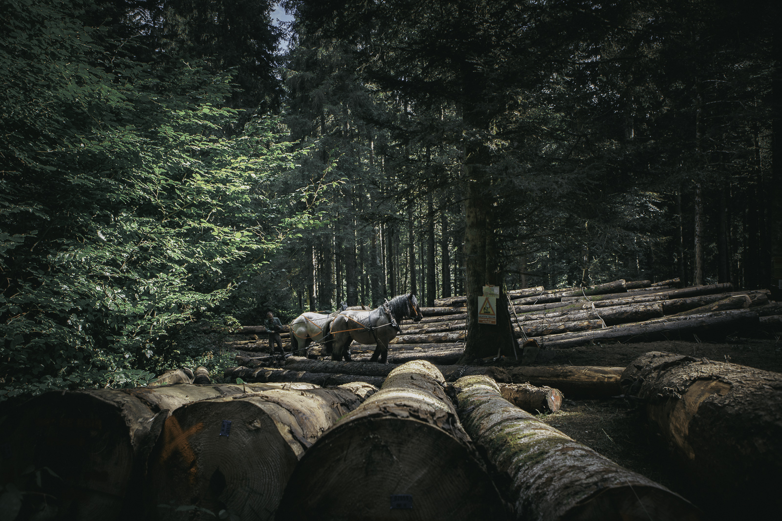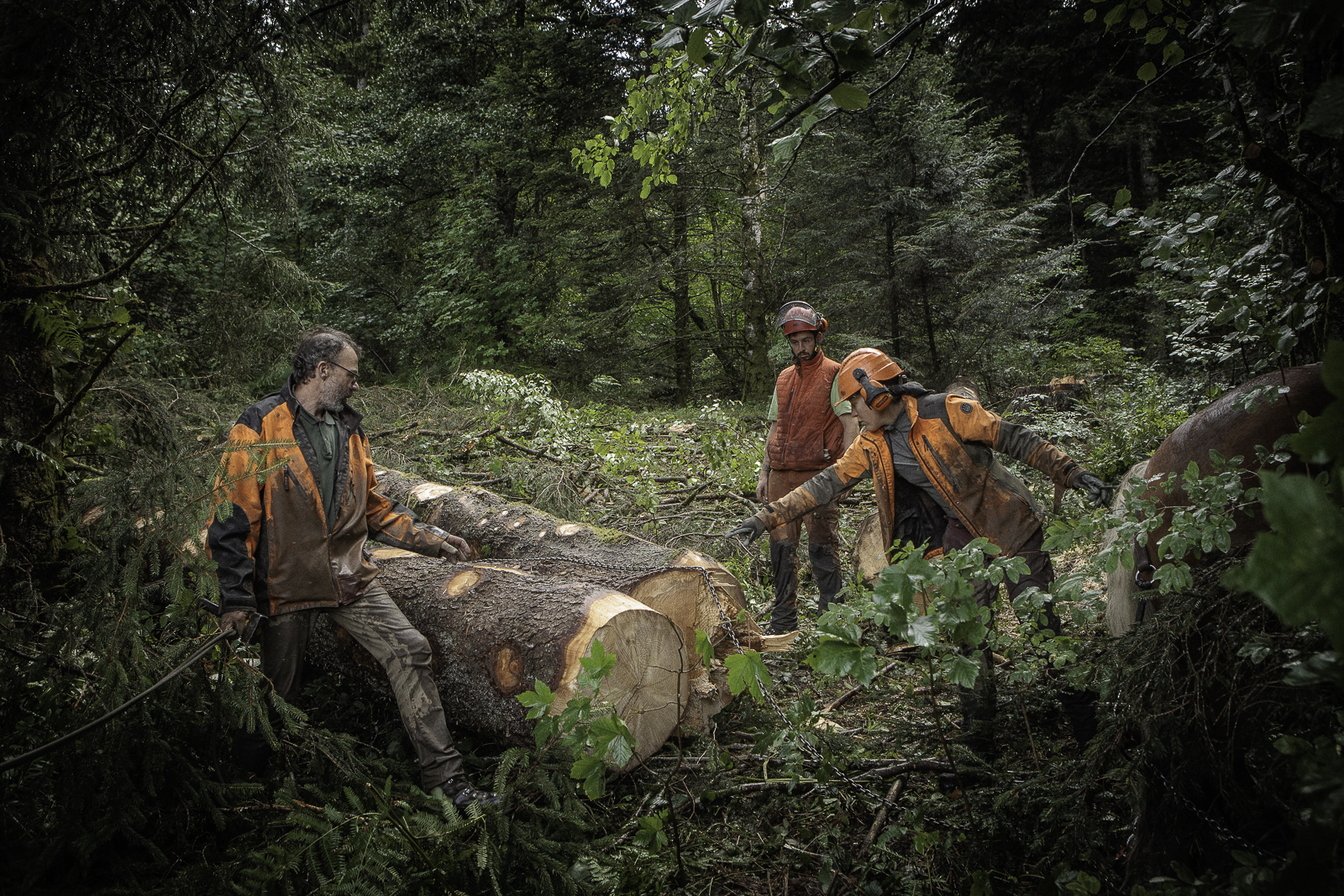 François, Marie Anne et Nadir. Travaux de débardage à cheval – Août 2025 – Marais des Seiglières