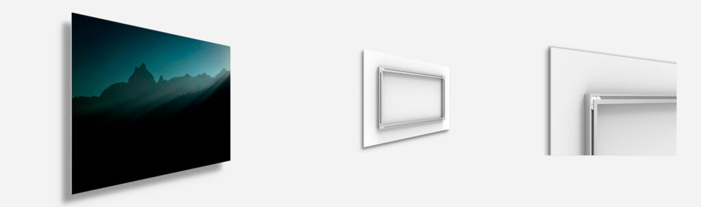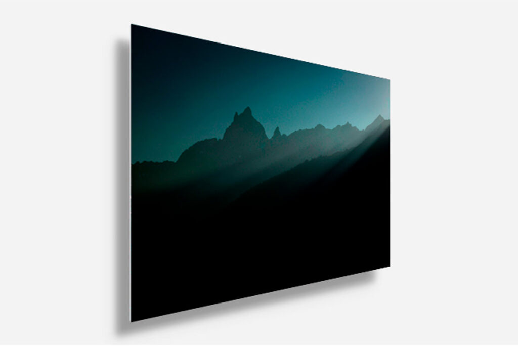 – tirage direct sur Dibon ( Plaque alumium de 3mm d’épaisseur ) avec chassis rentrant ( rails métaliques fixés au dos du tirage, permettant une accroche facile, et de décaler légèrement la photo du mur pour une belle mise en valeur du tirage )